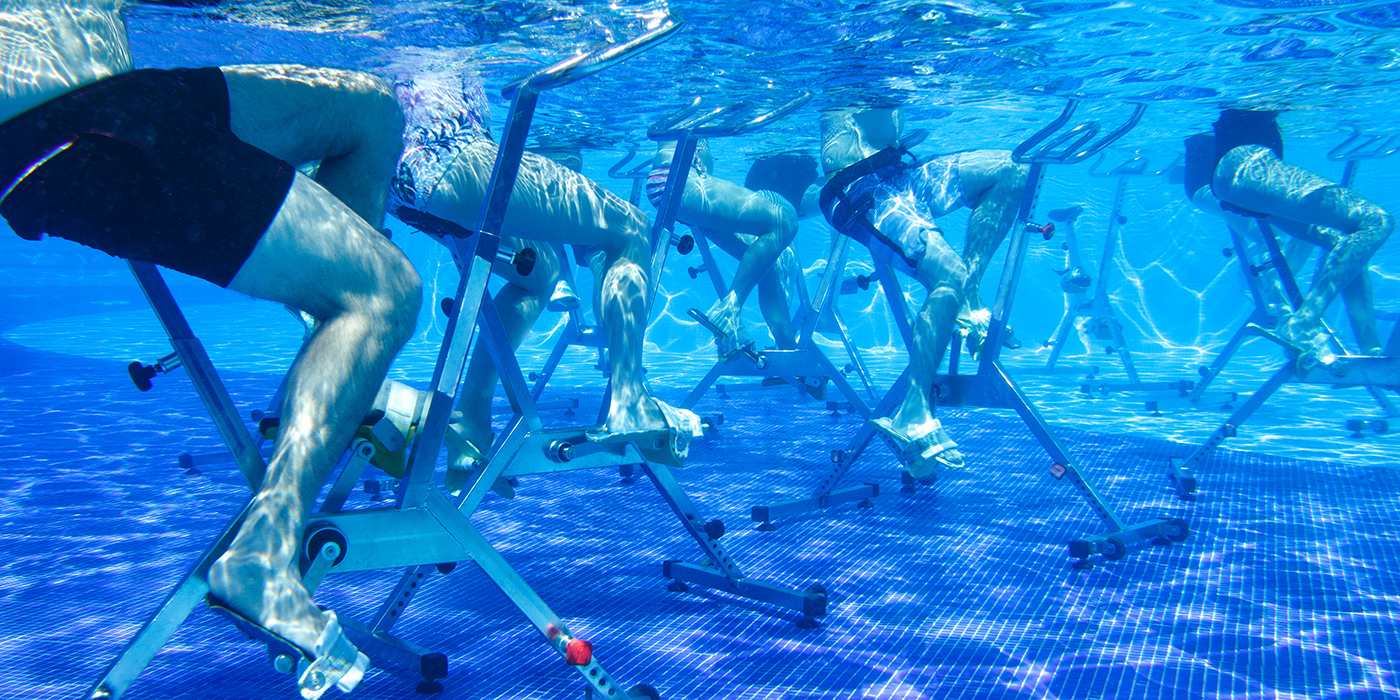 La séance débute par un échauffement dans l’eau, permettant d’activer le corps en douceur. Une fois installés sur les vélos aquatiques, les participants enchaînent différents exercices :
